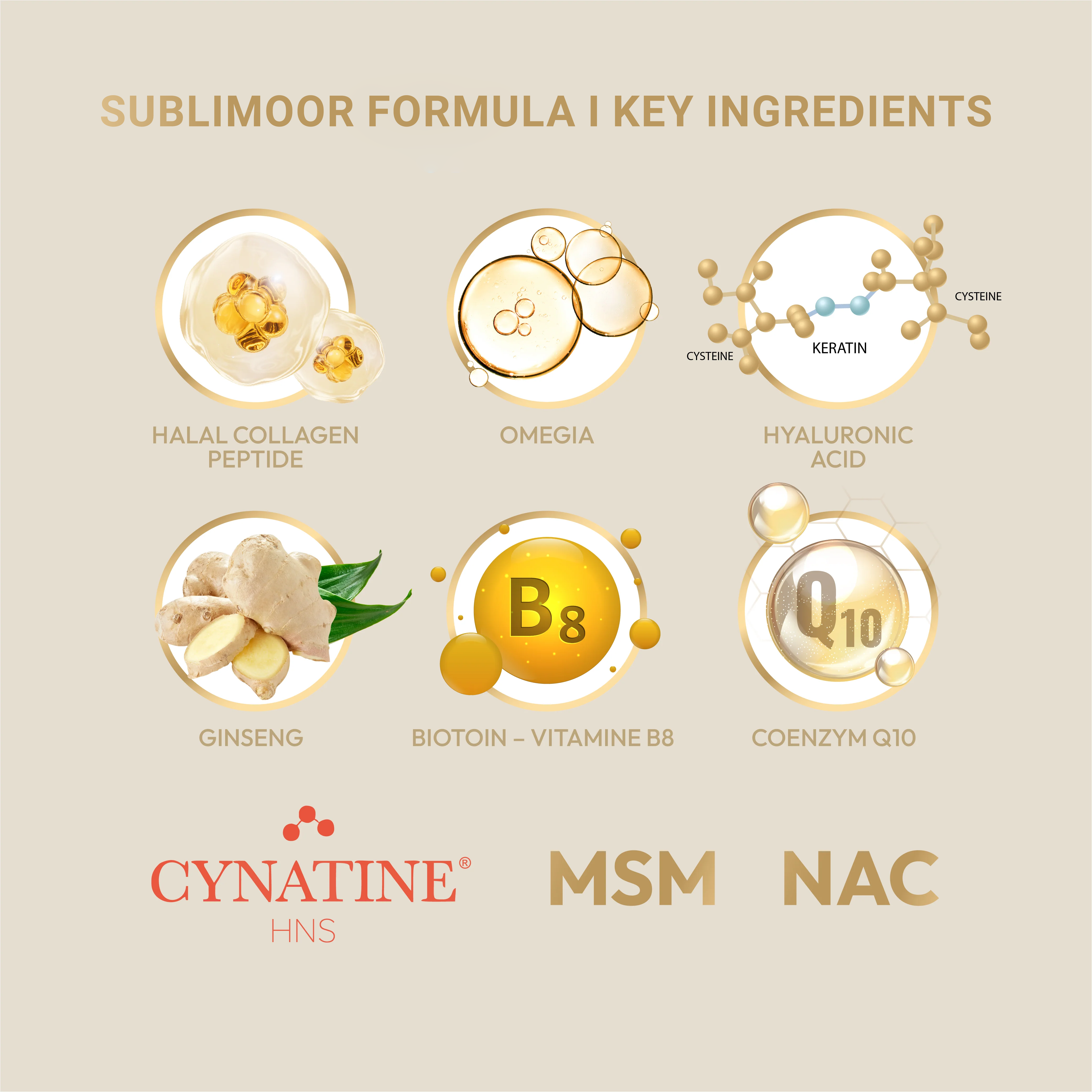 Formulated with halal collagen peptides, omega-3 fatty acids and hyaluronic acid to hydrate the skin and support beauty. It is also enhanced with ginseng, MSM, CoQ10 and biotin (vitamin B8) to provide antioxidant protection and promote cellular health.