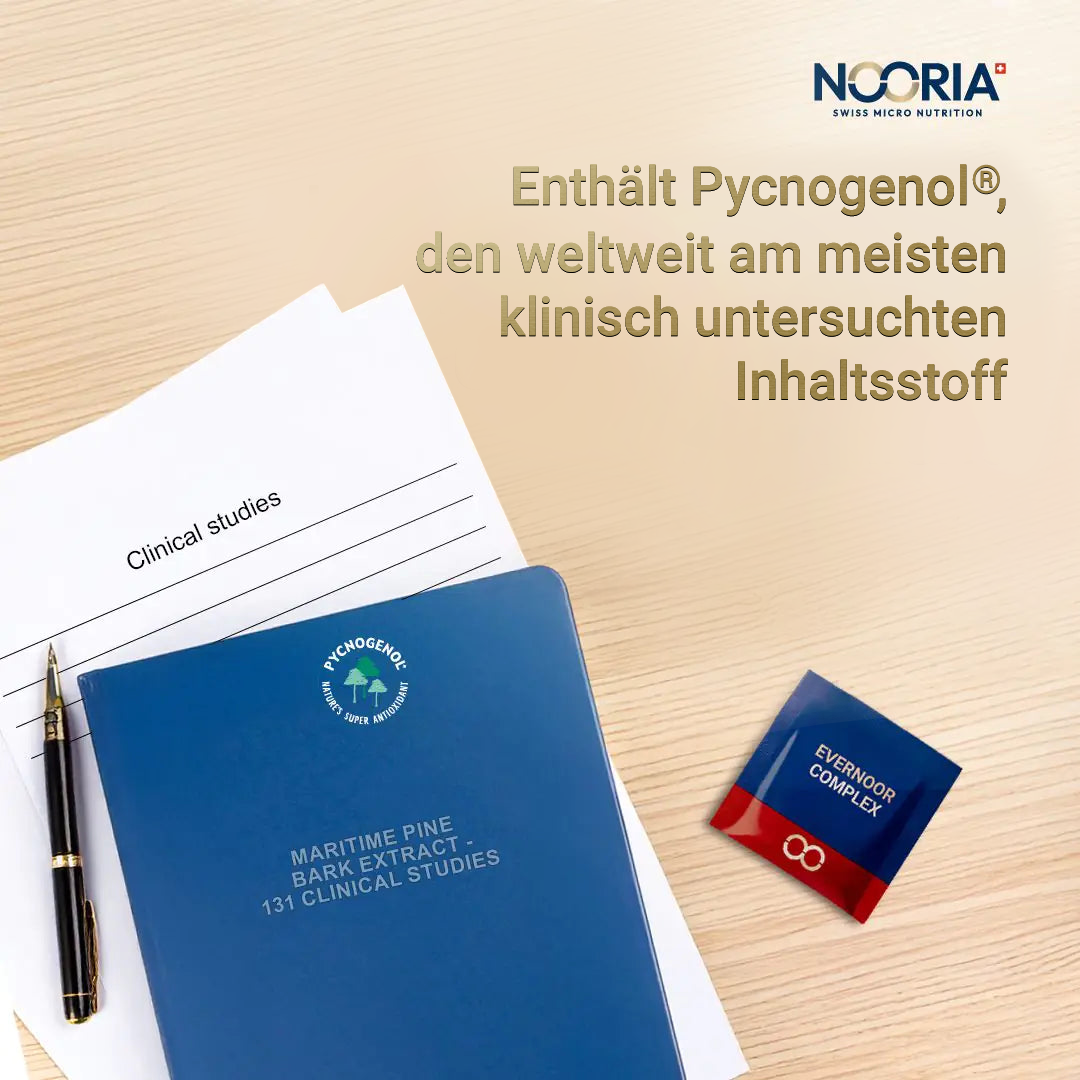 Ein praktischer Beutel bietet eine hohe antioxidative Wirkung und Anti-Aging-Vorteile, enthält Pycnogenol®, den weltweit am besten klinisch untersuchten Inhaltsstoff, und ersetzt 17 Nahrungsergänzungsmittel durch eine unkomplizierte Schweizer Rezeptur.